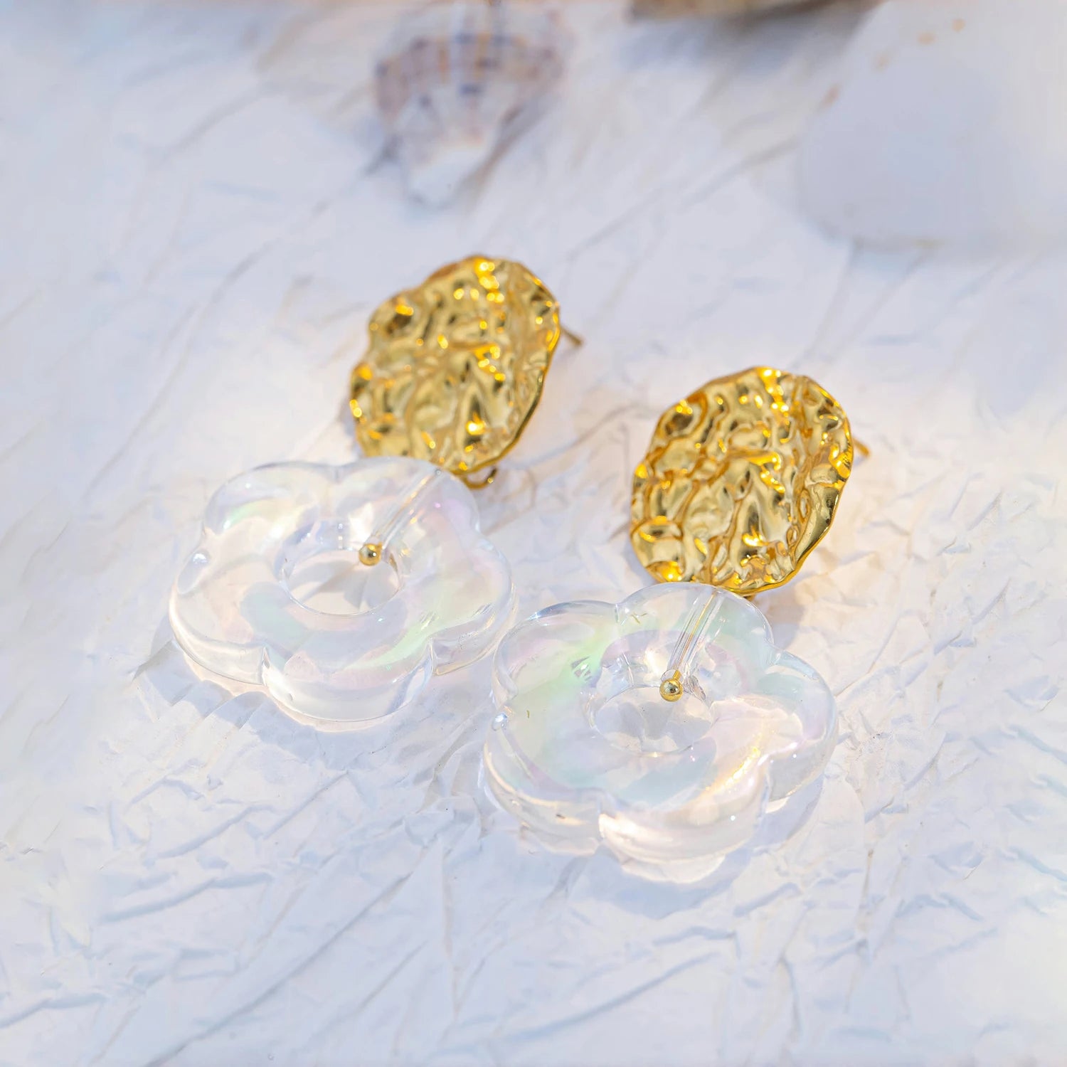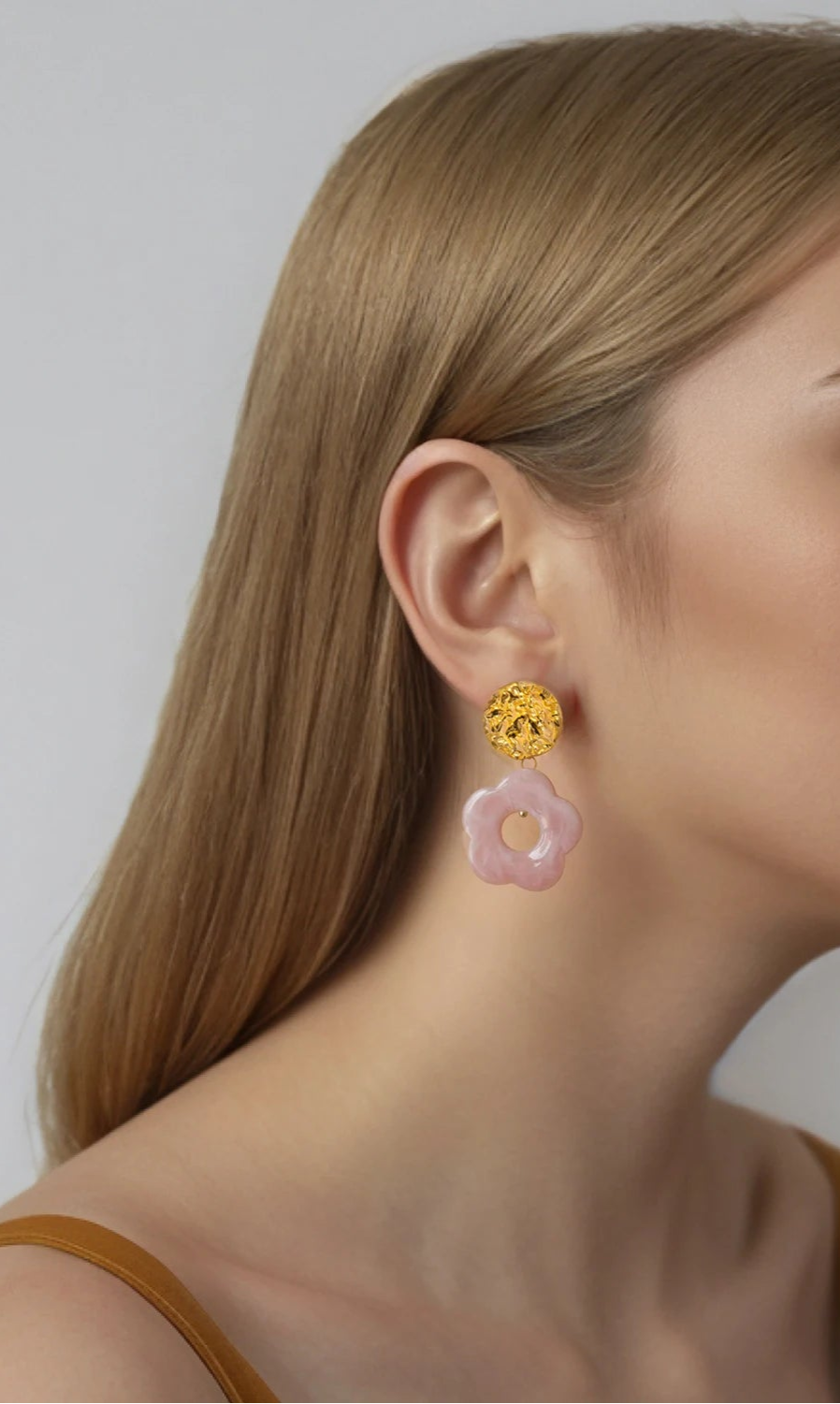 Un bouton doré martelé, une fleur en résine légère et colorée : ces boucles sont un mélange parfait entre tendance, fraîcheur et audace.